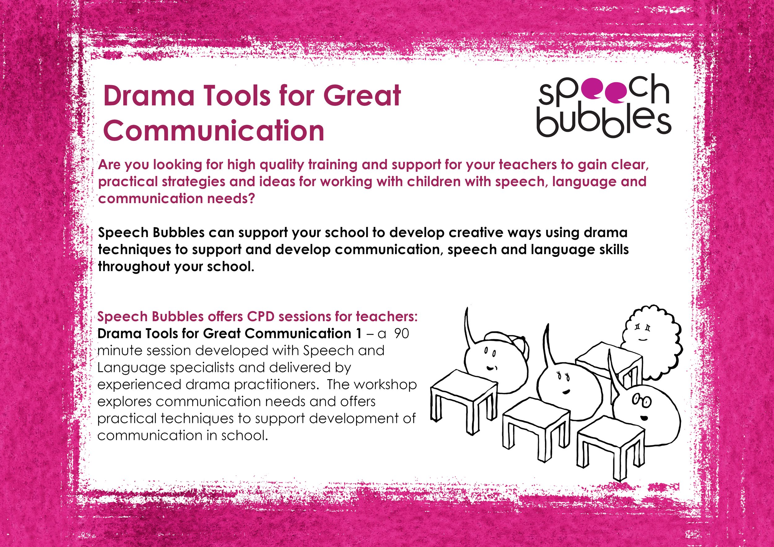 The CPD was developed alongside schools staff, drama practitioners and children. We also worked with independent Speech and Language Therapist Andrea Richards. In this short paper she connects the drama activities with relevant Speech, Language and Communication strategies.